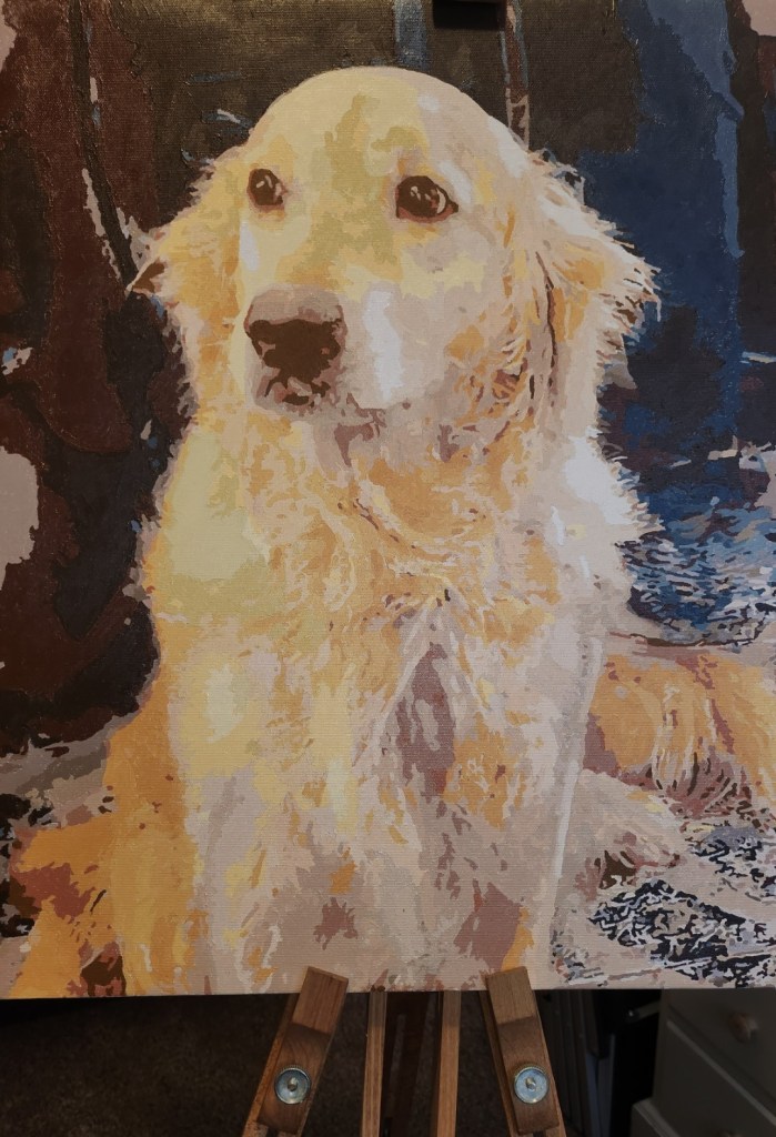 One of the things that I have started this year is paint by numbers. The first few that I did were pictures from the Number Artist site but once I discovered that you could have your own pictures turned into canvases, I got some of the dog pictures done. I did the one of Talisa and Kyra at the canine dip and dive for Kim as a Christmas present and I have just completed one of Morwenna.