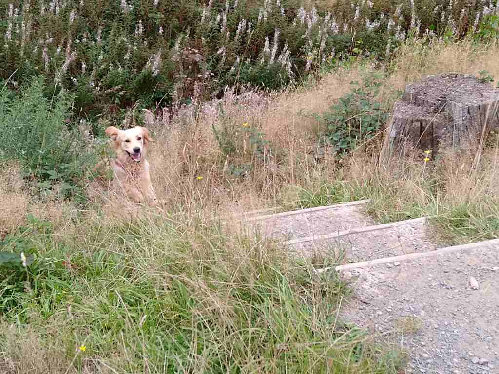 Another wood in the Eggesford area. We parked at the entrance and walked through on the stony path until we reached an open area with a mound which had steps leading up to it. There was a bench here. Like the other woods, there were plenty of side paths into the wood for the dogs to explore.