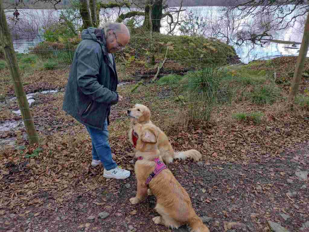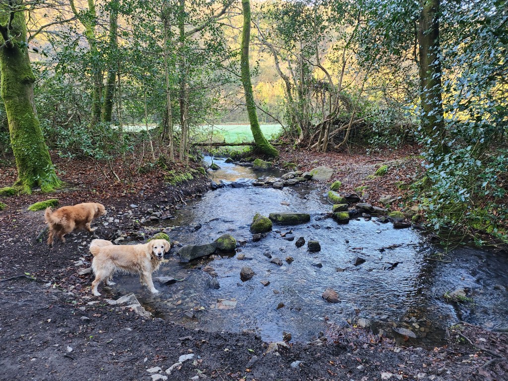 On this occasion we went to the dog exercise area (we managed to park just outside) and we were the only ones in it although there were a lot of people walking their dogs on a lead on the road. The paths were a mixture of stones, grass and a few muddy bits. At the bottom of the path we turned right which took us along the reservoir towards a stream which ran into the reservoir. There was also a small pond, deep enough for Jenna to swim in. The one issue in terms of security is that although the fence is secure, the gates into the area and from the area to the reservoir have a large enough gap at the bottom for our Goldies to get through and before we knew it, they were in the reservoir. The stream was quite fast flowing but not deep, and it is only a short distance to the reservoir which is calm. The area is wooded and they had a great run around.